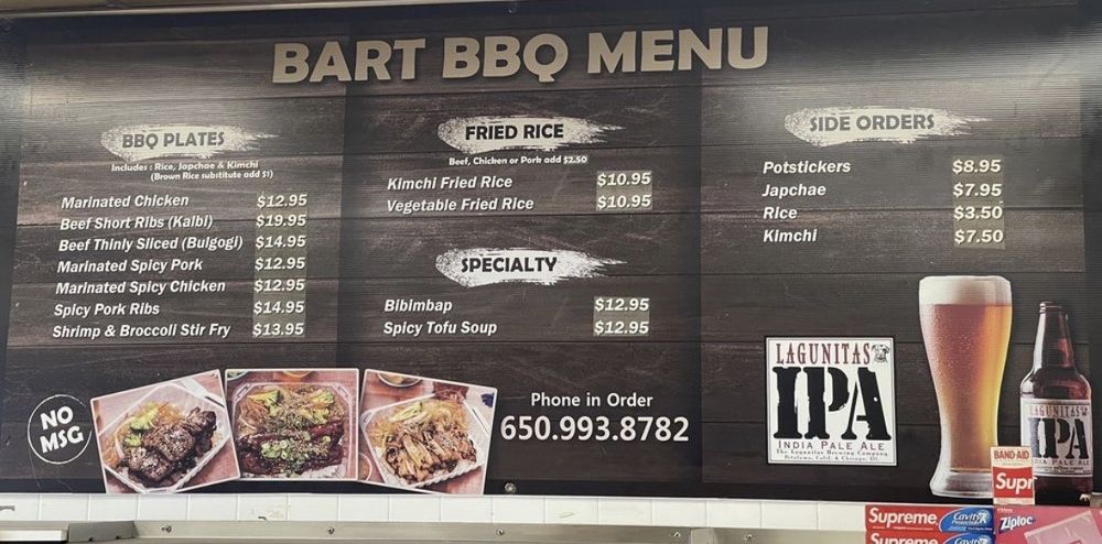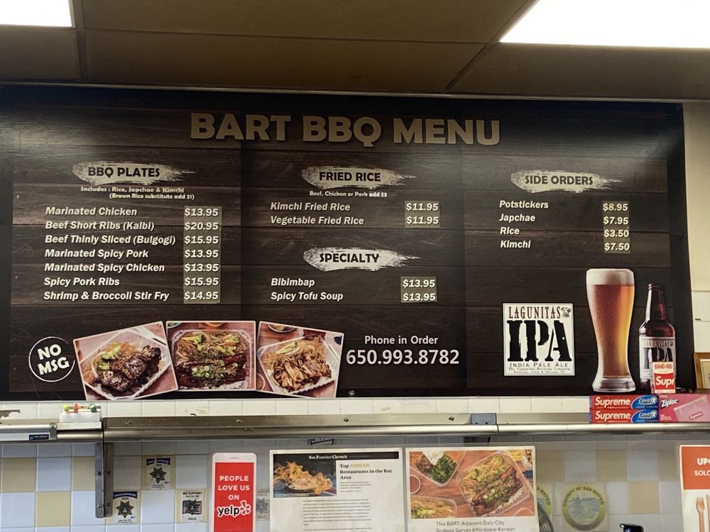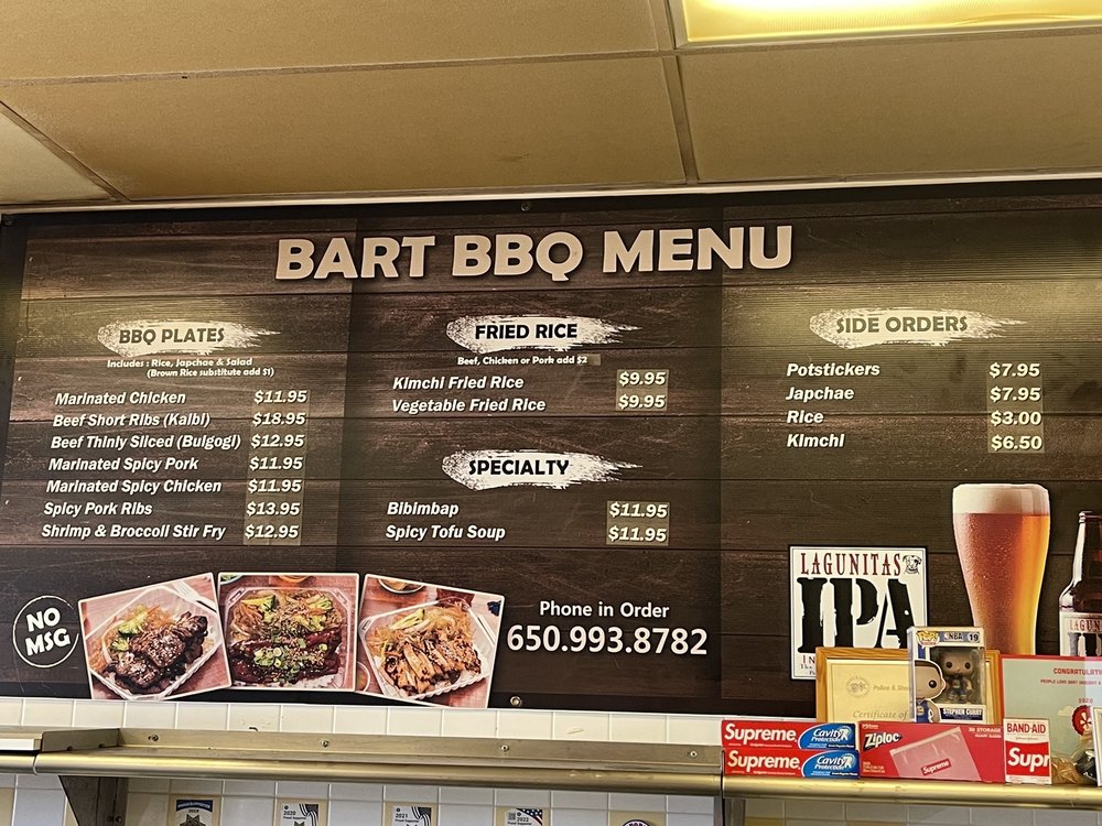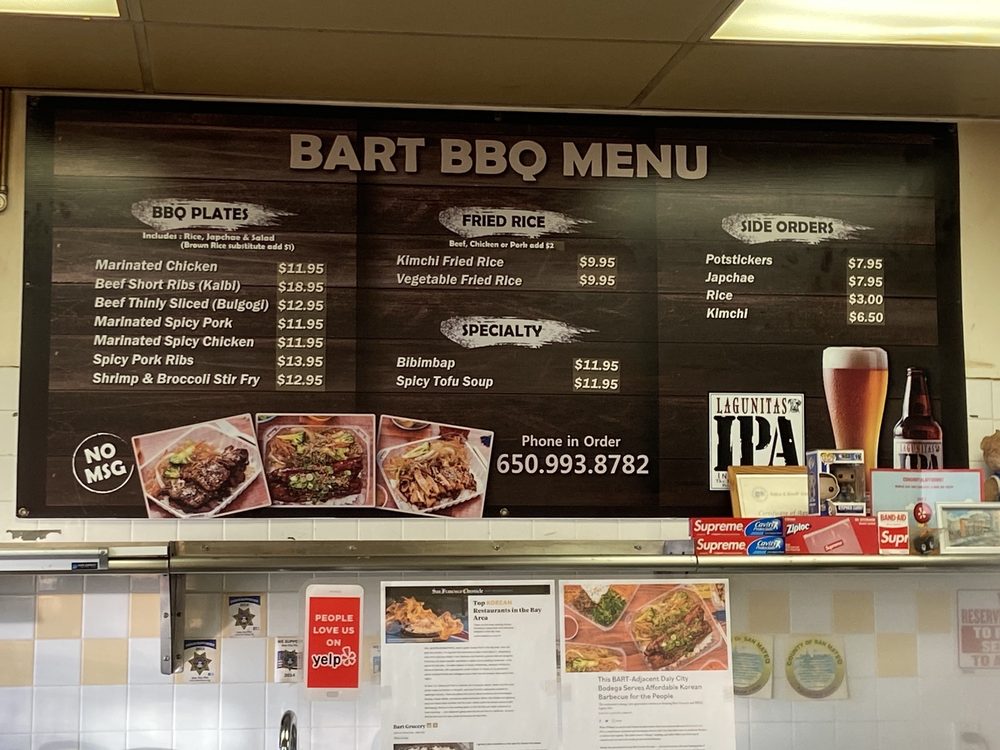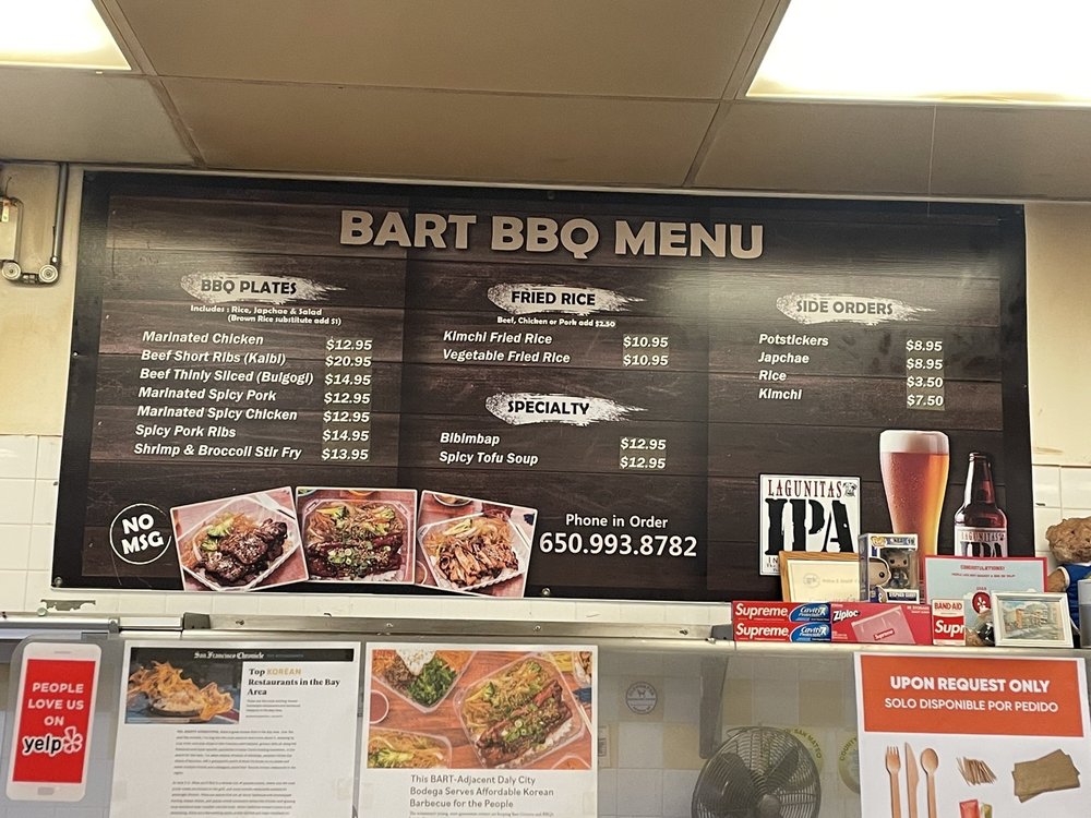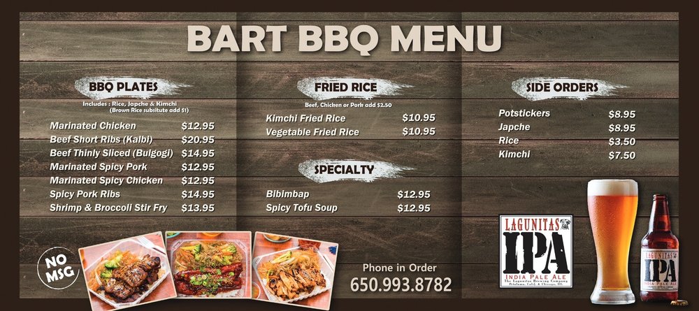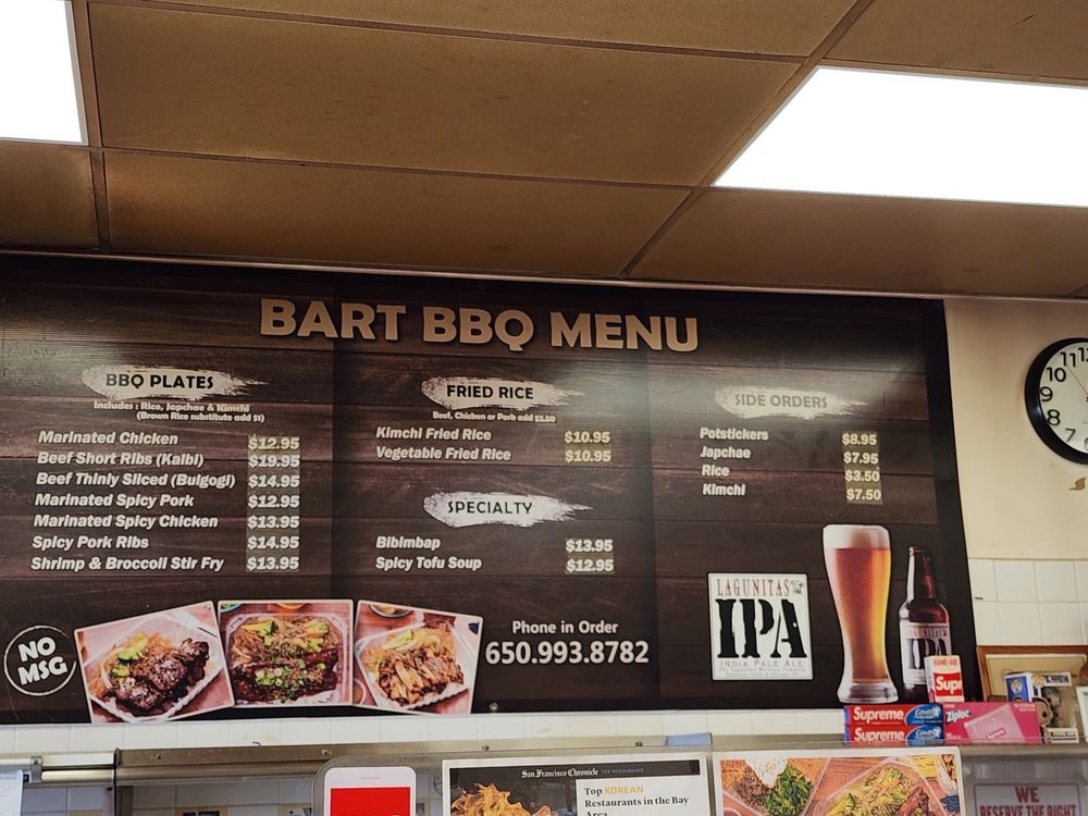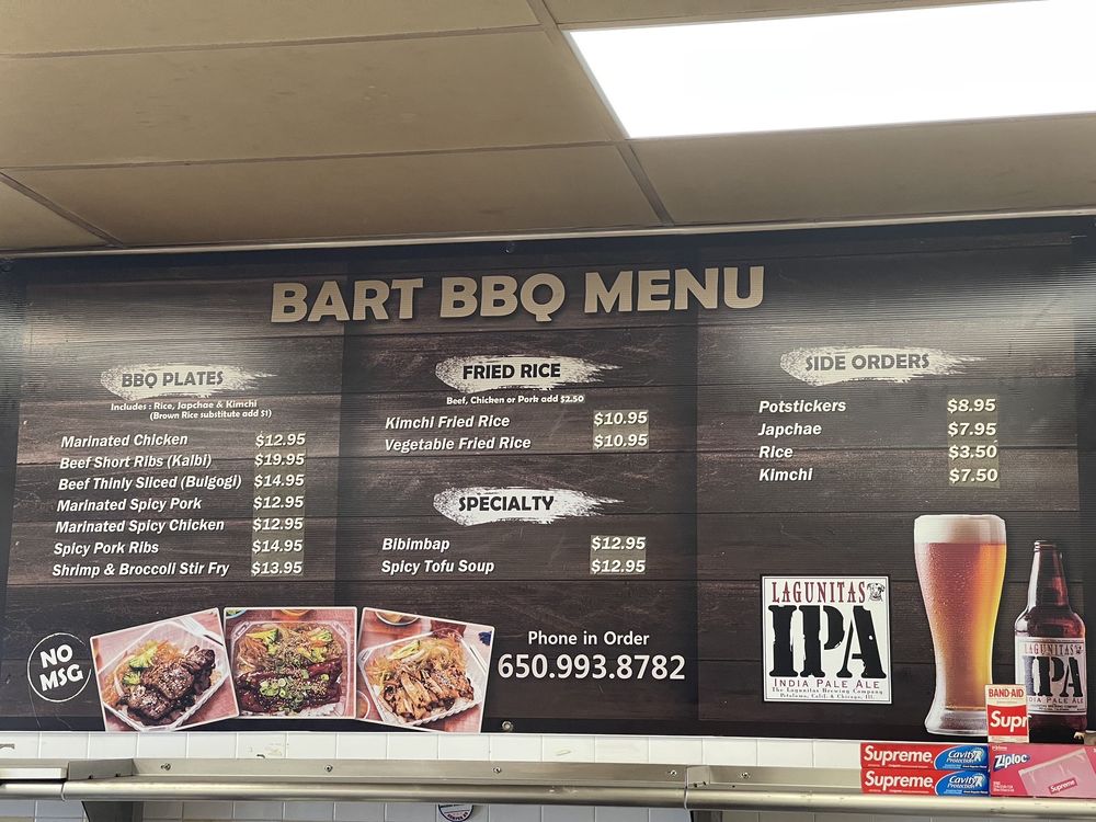 Introducing the menu at Bart Grocery BBQ, a hidden gem in Daly City offering Korean barbeque delights. Indulge in savory BBQ plates like Spicy Pork Ribs, Beef Bulgogi, and Spicy Marinated Pork. Don't miss out on their Kimchi Fried Rice and flavorful Potstickers. Customers rave about the generous portions, reasonable prices, and friendly service. The marinated Galbi and BBQ Chicken are standout dishes, while the kalbi and bibimbap are also highly recommended. Enjoy the mom and pop atmosphere with fast service and great quality food. Though it's a to-go place, the food is too good to resist. Make sure to stop by Bart Grocery BBQ for a satisfying Korean dining experience.